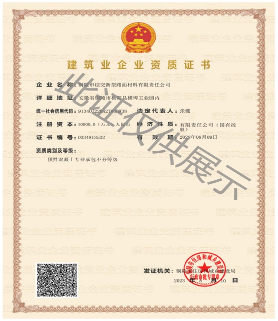 2023年8月,綜交新材料公司順利獲得建筑業(yè)企業(yè)預(yù)拌混凝土資質(zhì)證書,該項資質(zhì)的取得,標志著綜交新材料公司在行業(yè)內(nèi)的重大突破,進一步提升了在建筑行業(yè)內(nèi)的業(yè)務(wù)拓展能力和市場競爭力,更好地服務(wù)于G3銅陵長江公鐵大橋、G330一級公路改擴建工程、江北港鐵路專用線及江北新區(qū)發(fā)展等重點項目的建設(shè),同時為綜交新材料公司在樅陽縣域混凝土市場上站穩(wěn)腳跟奠定堅實基礎(chǔ)。