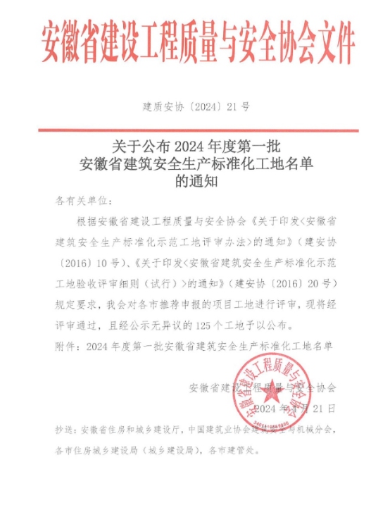 4月21日,安徽省建設工程質量與安全協(xié)會公布了2024年度第一批安徽省建筑安全生產標準化工地名單,由銅陵交投置業(yè)有限公司開發(fā)建設的鳳起宸鳴府項目喜獲“安徽省建筑安全生產標準化示范工地”稱號。