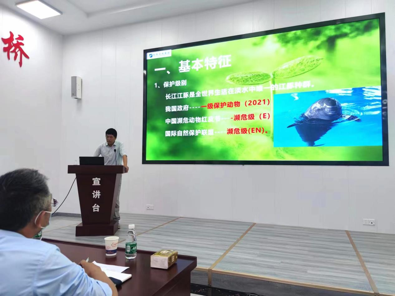 在世界環境日活動中,江豚保護專家鄭邦友結合自己近四十年江豚保護和科研經歷,以詳實的視頻和照片,向參訓人員介紹了長江江豚的基本特征、救護要點和運輸方法,并現場發放環保宣傳手冊,切實提高G3公鐵橋參建人員的環保意識。