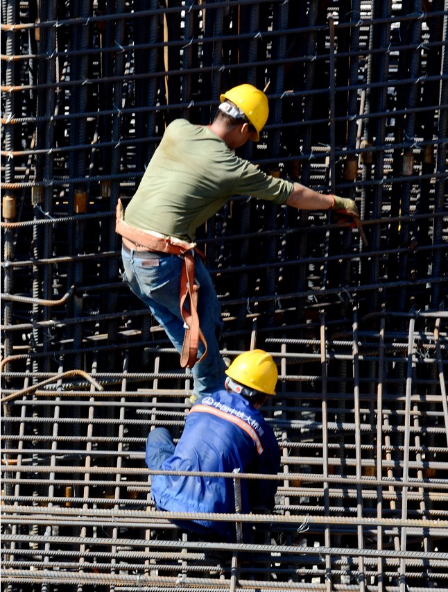 焊花飛舞、機(jī)器轟鳴,上午6時(shí)不到,鋼筋綁扎工劉友勇就和工友穿梭在“鋼筋森林”中。在下游側(cè)承臺(tái)9米多高的作業(yè)平臺(tái)上,劉友勇像蜘蛛人一樣緊貼著剛捆扎好的“樹干”,正在綁扎南主墩塔座鋼筋。承臺(tái)上沒有任何遮擋,劉友勇和工友們完全暴露在烈日下。雖然天氣很熱,但幾乎所有鋼筋工都戴著厚厚的手套,不少人的手套甚至還磨破了。“現(xiàn)在這時(shí)候,鋼筋表面溫度有六七十?dāng)z氏度。不戴手套拿不了鋼筋,很燙的。”劉友勇一邊笑著,一邊抓住滾燙的鋼筋,嚴(yán)格按照?qǐng)D紙尺寸和間距,一根一根地將鋼筋綁扎固定起來(lái)。由于長(zhǎng)時(shí)間觸摸滾燙的鋼筋,他的手套一直處于被汗水濕透的狀態(tài)。