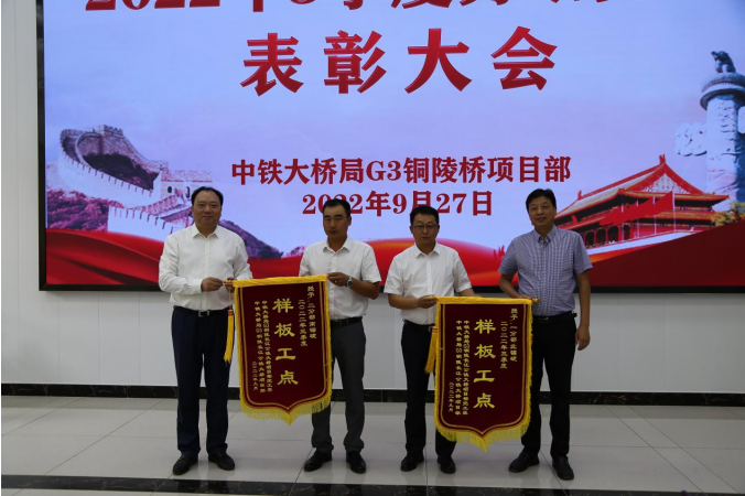 會上,表彰了G3銅陵長江公鐵大橋項目第三季度勞動競賽獲獎單位,觀看了全橋施工航拍視頻,了解了項目進展情況及存在問題,并明確了第四季度施工生產計劃。