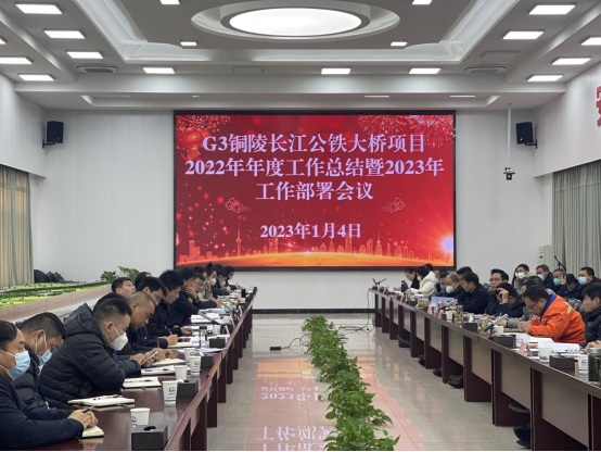 2023年1月4日下午,G3銅陵長江公鐵大橋2022年年度工作總結(jié)暨先進集體、先進工作者表彰大會在項目部會議室召開。集團公司黨委書記、董事長何成龍出席會議,中鐵大橋局四分公司黨委書記、執(zhí)行董事王立忠、總經(jīng)理寧朝新,以及各參建單位負(fù)責(zé)人等參加會議。會議由集團公司黨委委員、副總經(jīng)理、銅陵長江公鐵大橋投資公司總經(jīng)理湯世才主持。