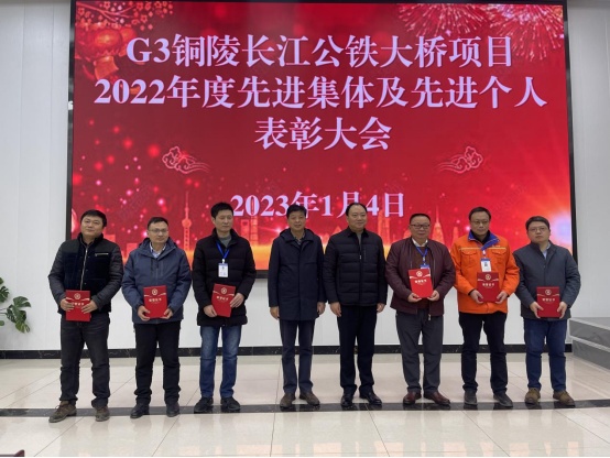 會上,項目部匯報了2022年度施工總結(jié)及2023年施工計劃,項目辦匯報了2022年度管理工作情況及下一步工作重點,最后,銅陵長江公鐵大橋投資公司宣讀2022年度先進集體及工作者表彰決定并頒獎。