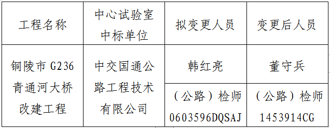 銅陵市G236青通河大橋改建工程中心試驗室,于2019年9月29日開標,中標單位為中交國通公路工程技術有限公司。因原中標項目負責人個人家庭原因,無法到崗履行合同責任與義務,故中交國通公路工程技術有限公司申請中心試驗室項目負責人變更?,F將項目負責人變更情況予以公示,如有異議,請于7日內向銅陵市綜合交通投資集團有限公司反映。