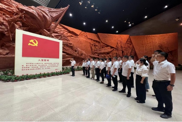 在渡江戰役紀念館內,G3公鐵橋項目部第一黨支部書記趙懿帶領全體黨員同志,面向黨旗,高舉右拳,莊嚴宣誓,在字字鏗鏘中重溫入黨誓詞,抒發對黨忠誠的堅定決心。黨員同志在講解員的帶領下,依次參觀戰前形勢、戰役準備、突破江防、戰役勝利、人民支前和英烈業績六大展廳,通過大量實物、圖片和文物資料,與歷史“對話”,與英雄“交流”,感受西梁山戰役的英勇、搶灘登陸的緊迫、烈士名錄廳的沉重,深刻感悟黨團結帶領人民歷經千難萬險攻克難關,創造奇跡的革命歷程。