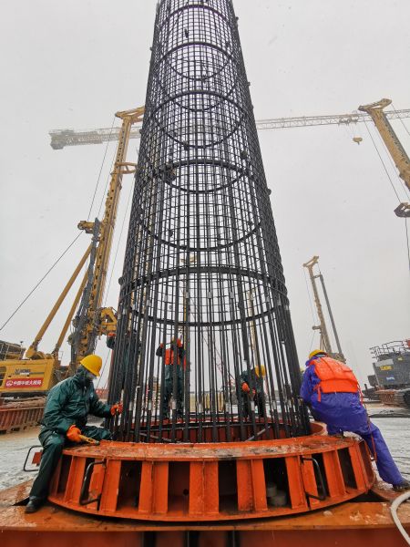 中新網(wǎng)安徽新聞2月7日電 (通訊員趙懿 完顏亮) 2月7日上午,連續(xù)十幾個(gè)小時(shí)大雪后,地上積雪已達(dá)到七八厘米厚,中鐵大橋局G3銅陵公鐵長(zhǎng)江大橋現(xiàn)場(chǎng)在大雪中大干。3#主墩,5臺(tái)旋挖鉆在同時(shí)施工,工人們冒著寒冷和大雪在安裝鉆孔樁的鋼筋籠。項(xiàng)目部為工人配發(fā)了雨衣、保溫棉服等御寒安全用品,保障安全作業(yè)。