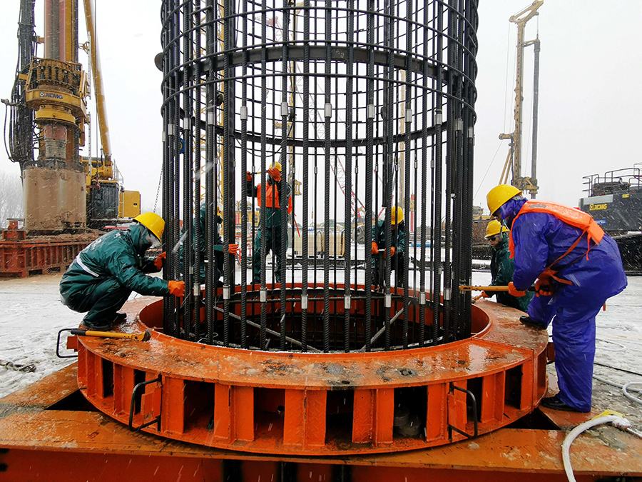人民網合肥2月9日電(陳浩)虎年上班首日,安徽銅陵出現降雪天氣,但建設者的熱情沒有絲毫減弱。為確保G3銅陵長江公鐵大橋建設進度,施工人員頂風冒雪為大橋3號主墩安裝鉆孔樁鋼筋籠。