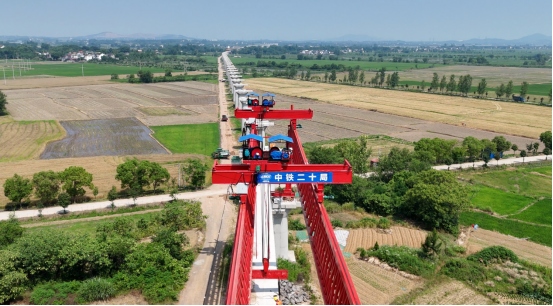 5月23日上午,在銅陵港江北港區鐵路專用線項目廬江段黃泥河特大橋施工現場,隨著長32米、重140噸的預制T梁平穩精準架設在黃泥河特大橋102號橋臺至101號墩上,標志著江北港鐵路專用線項目廬江段首片T梁順利架設,至此,銅陵段、廬江段全部進入橋梁架設施工。